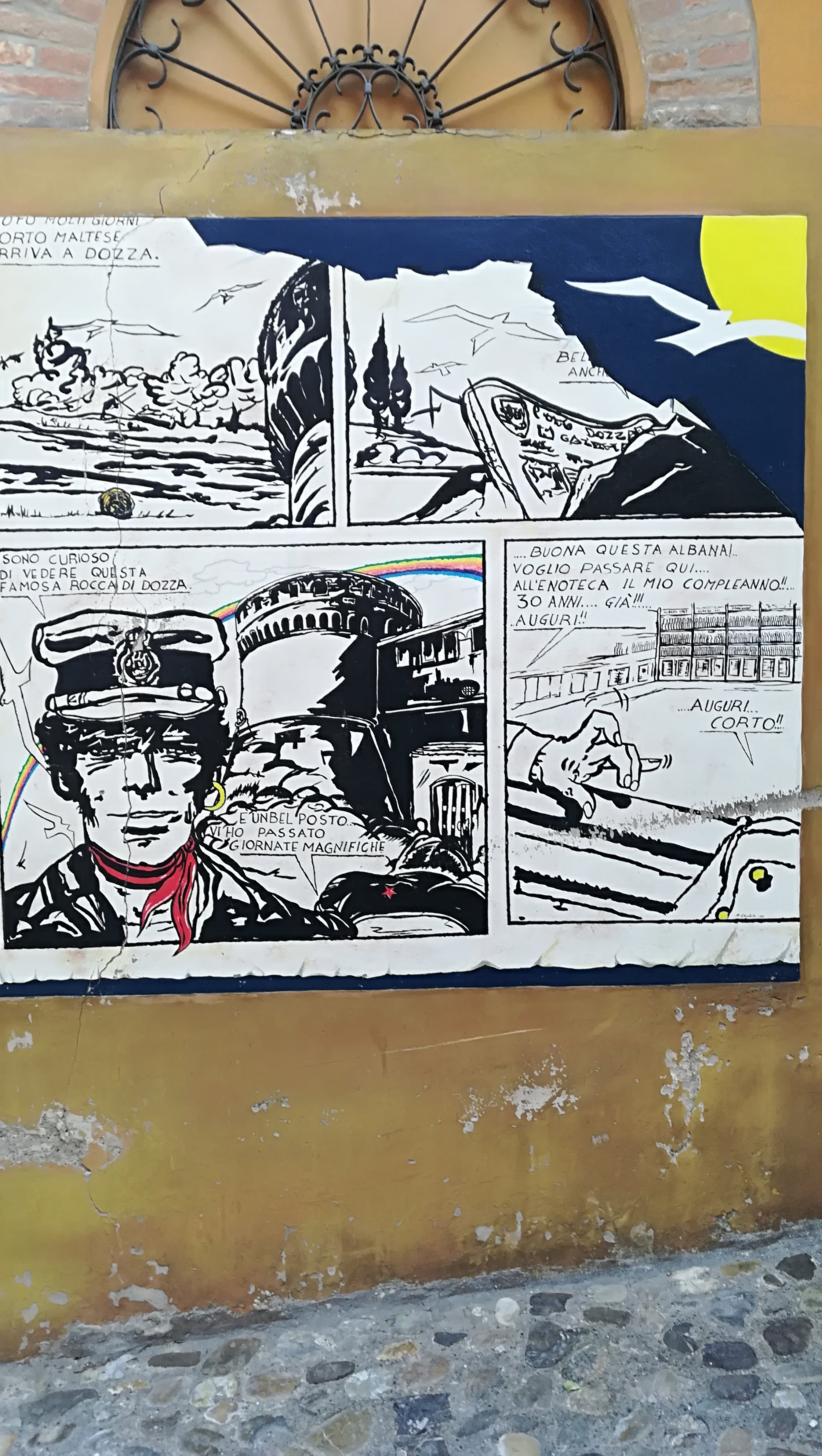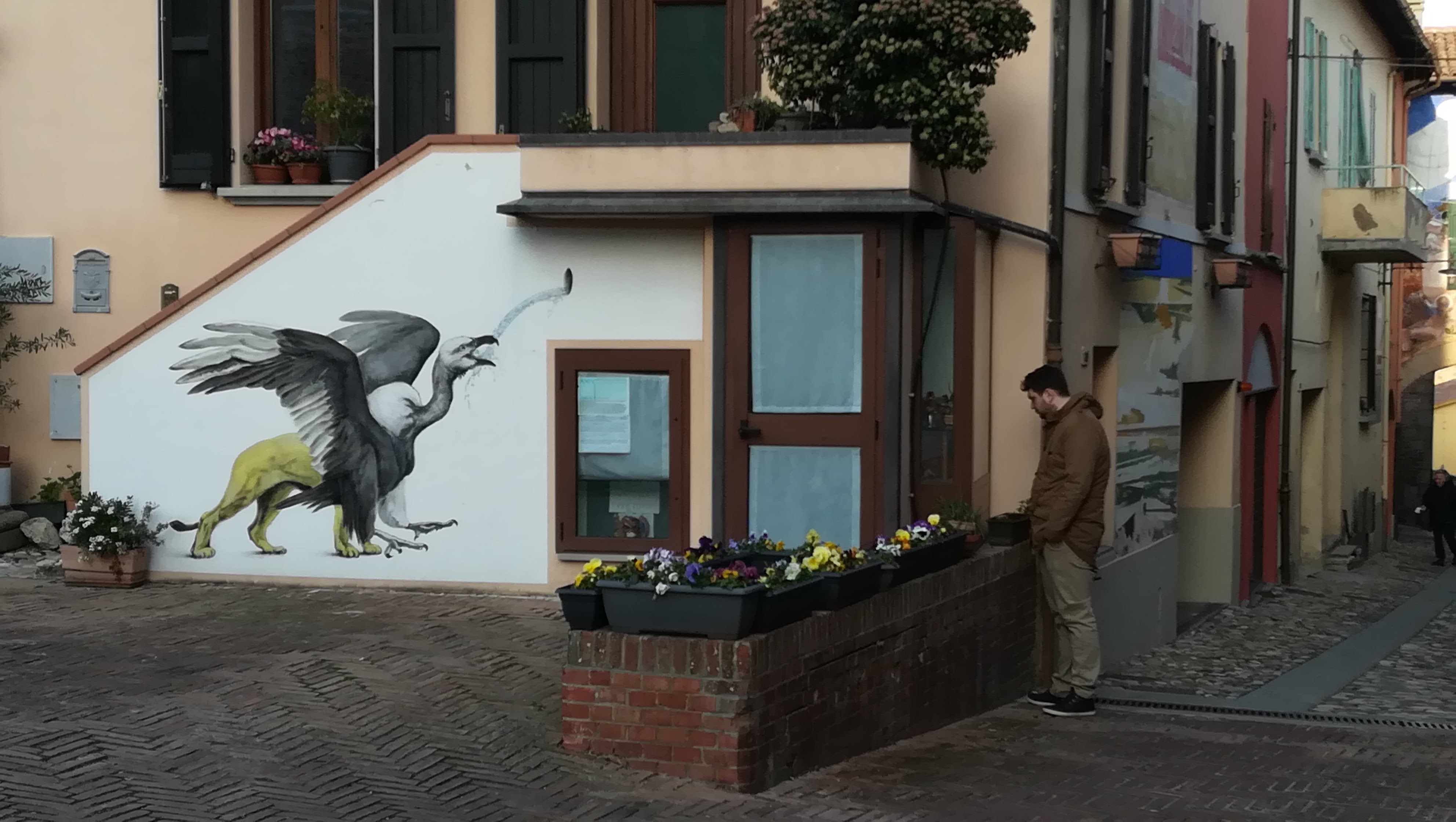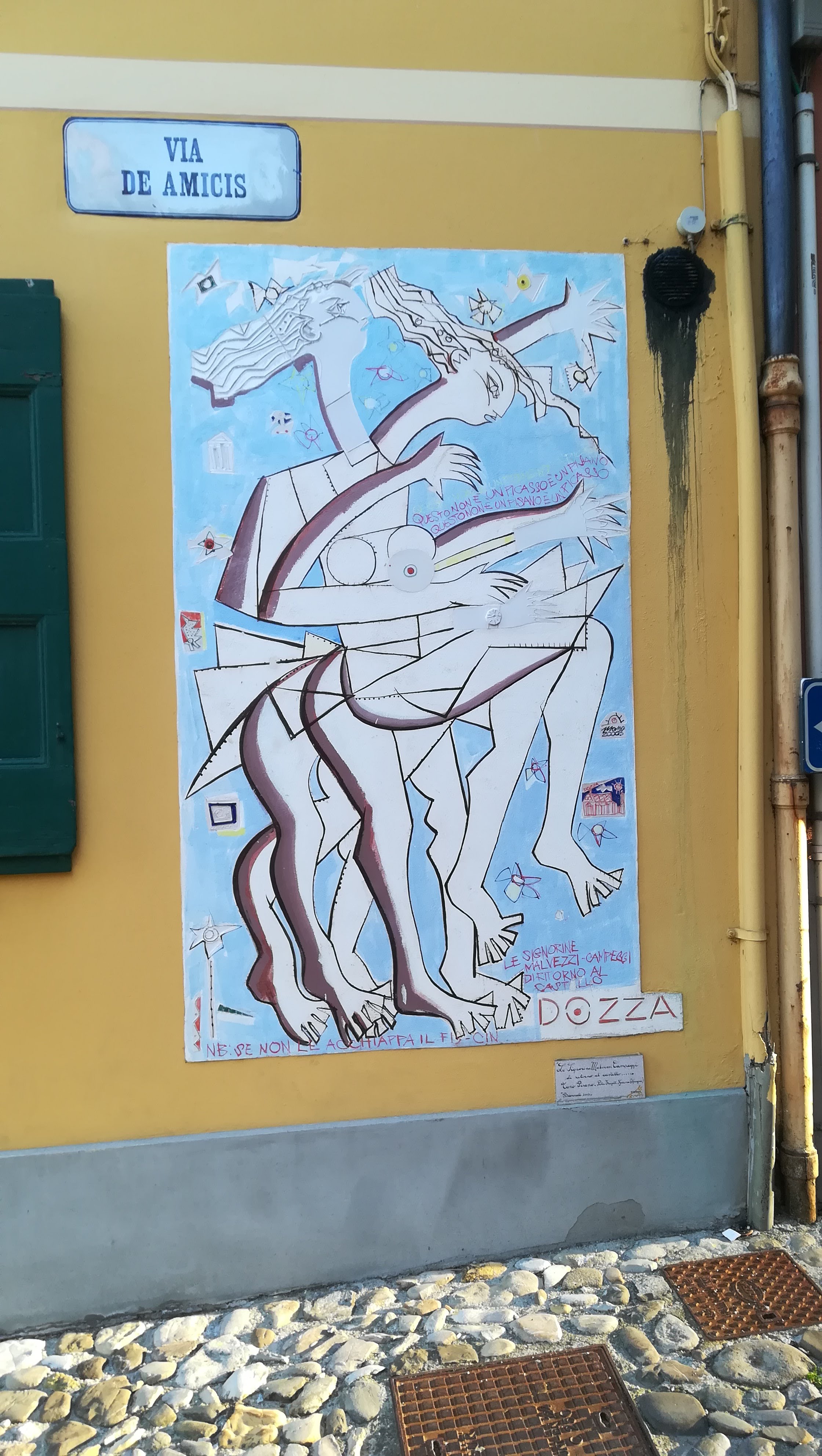 Perché visitare Dozza? Questo piccolo Borgo è un vero e proprio museo a cielo aperto, in cui si possono ammirare oltre un centinaio di opere che decorano i muri, le case e le pizze del borgo (quello che vedete nell’immagine a destra è un esempio).