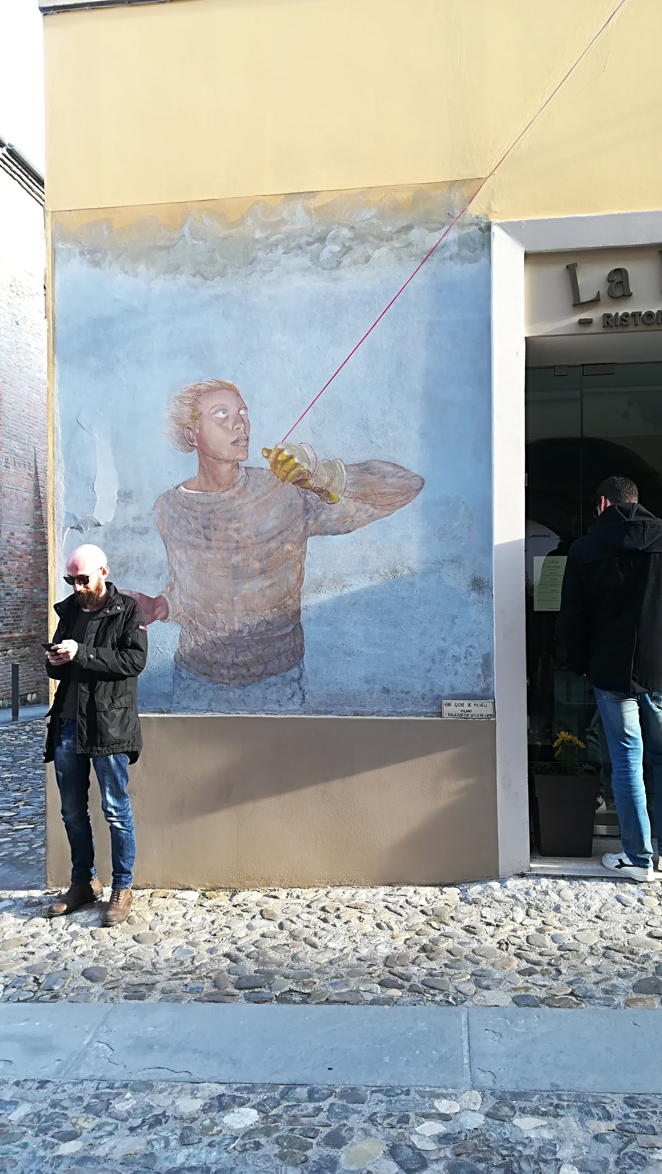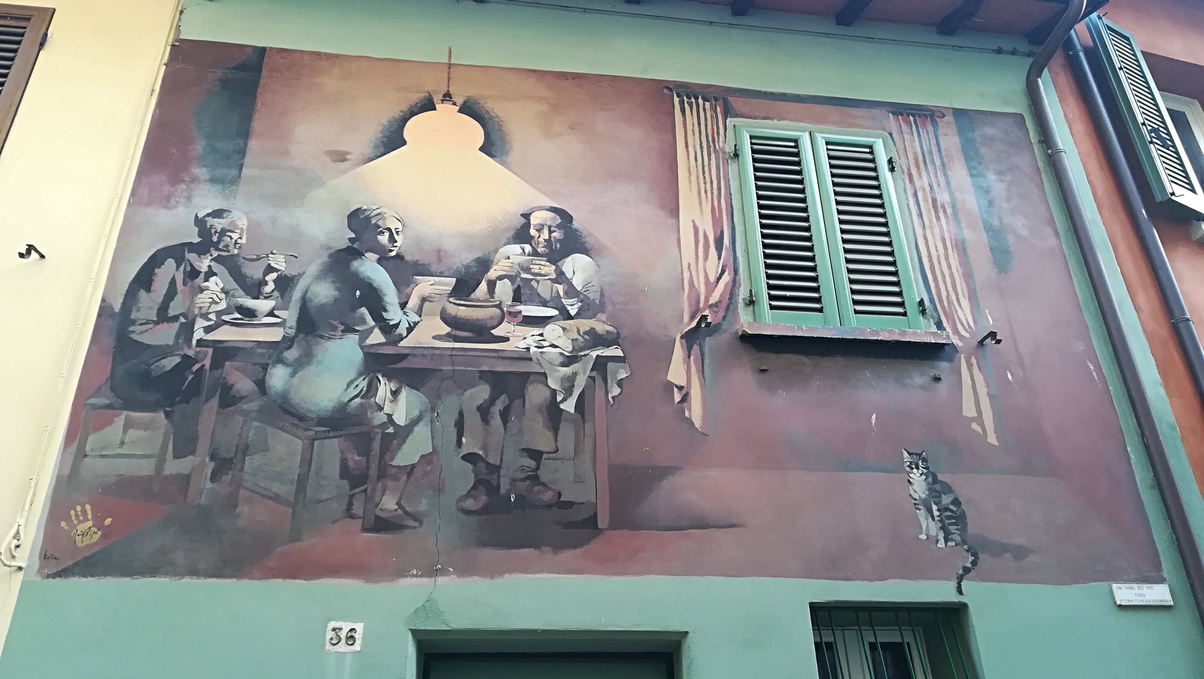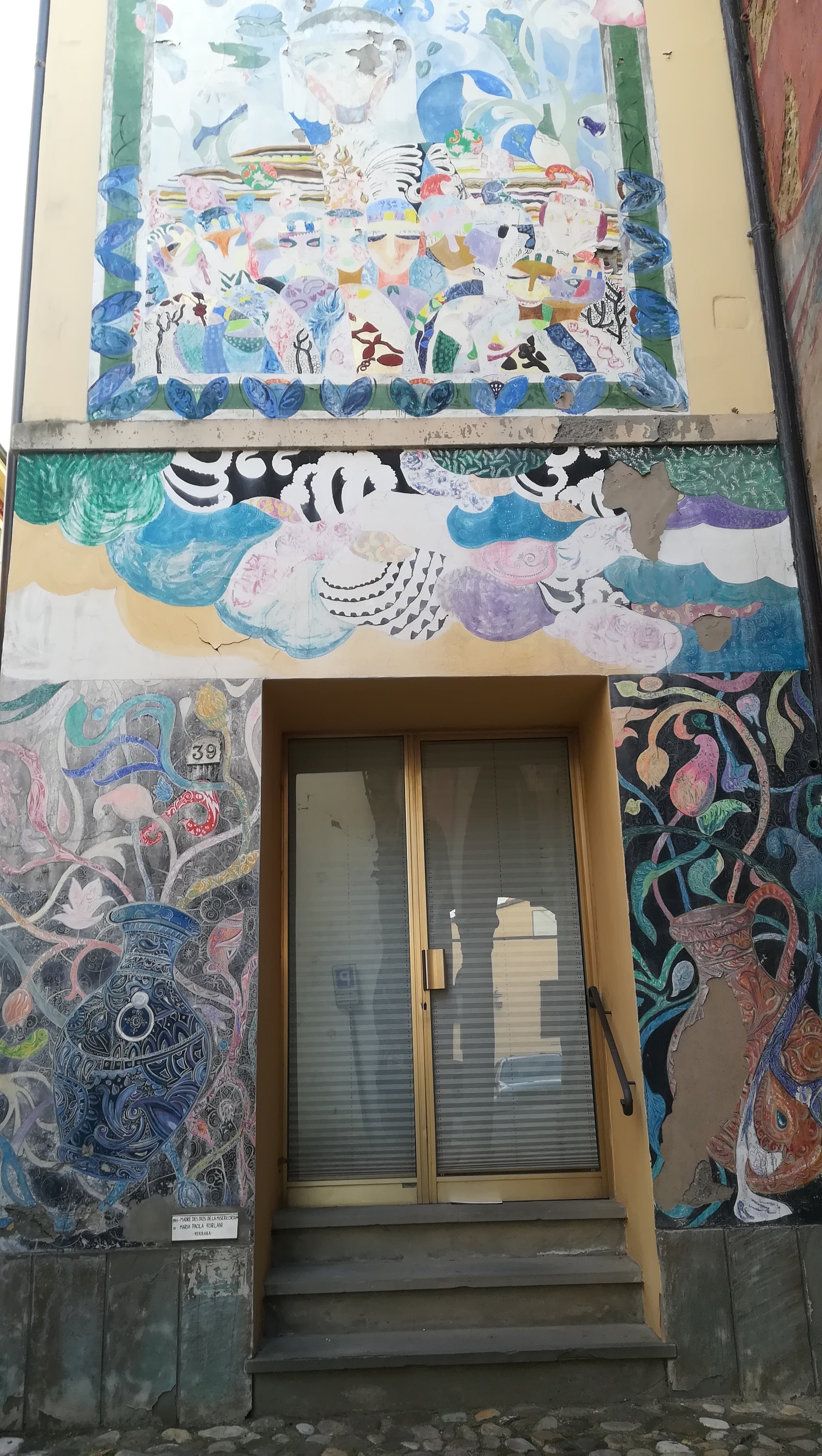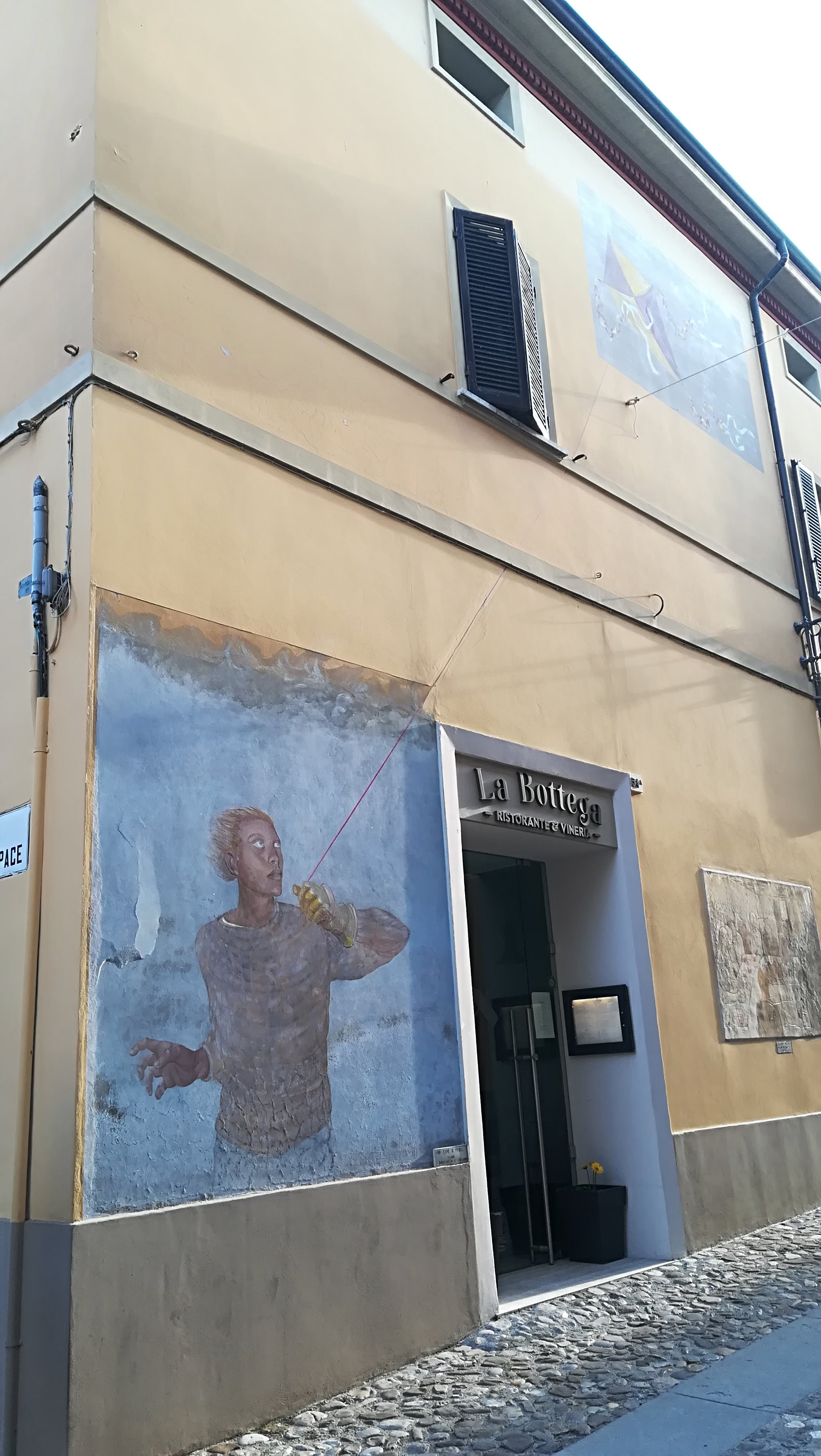 Perché visitare Dozza? Questo piccolo Borgo è un vero e proprio museo a cielo aperto, in cui si possono ammirare oltre un centinaio di opere che decorano i muri, le case e le pizze del borgo (quello che vedete nell’immagine a destra è un esempio).