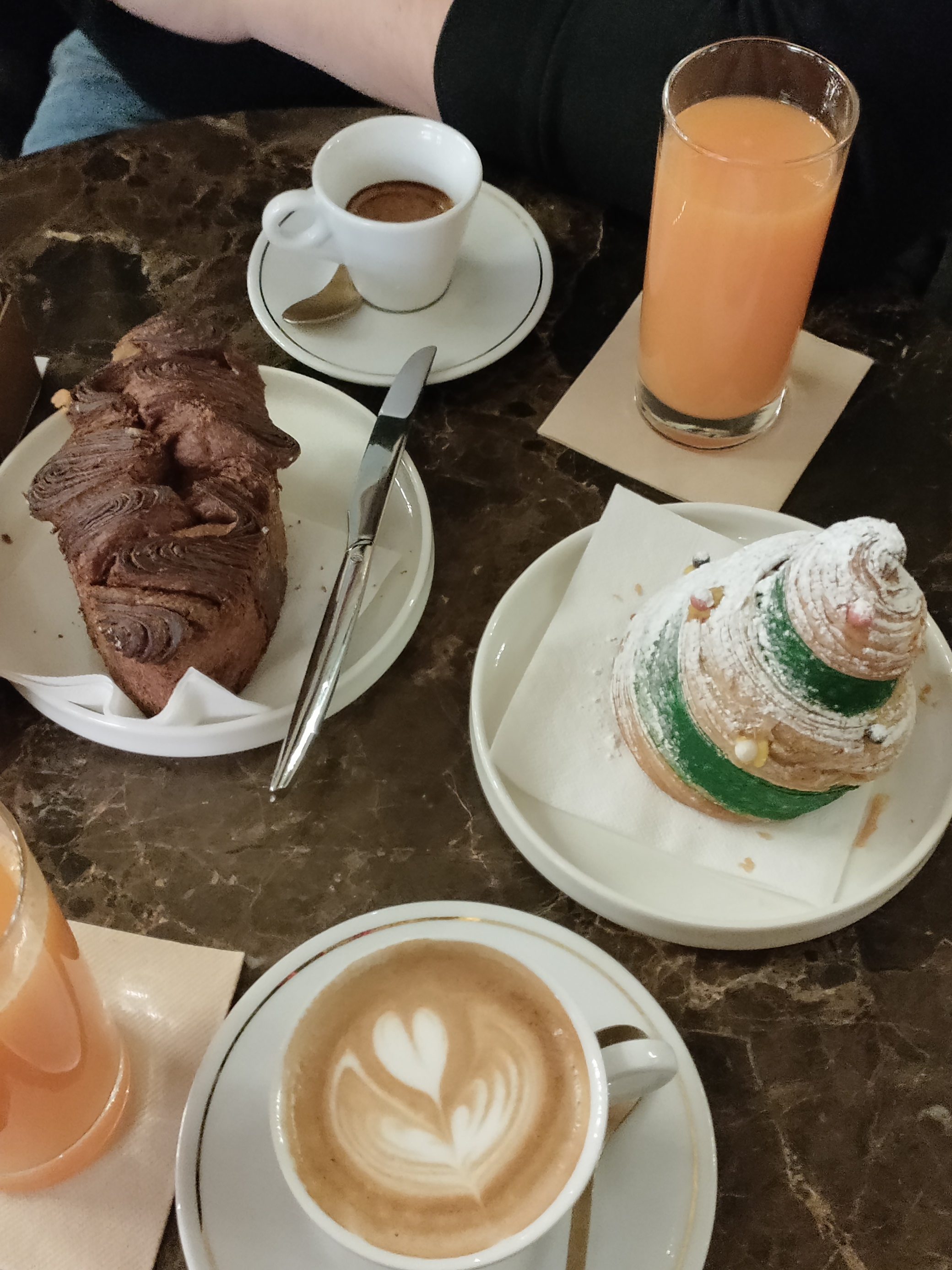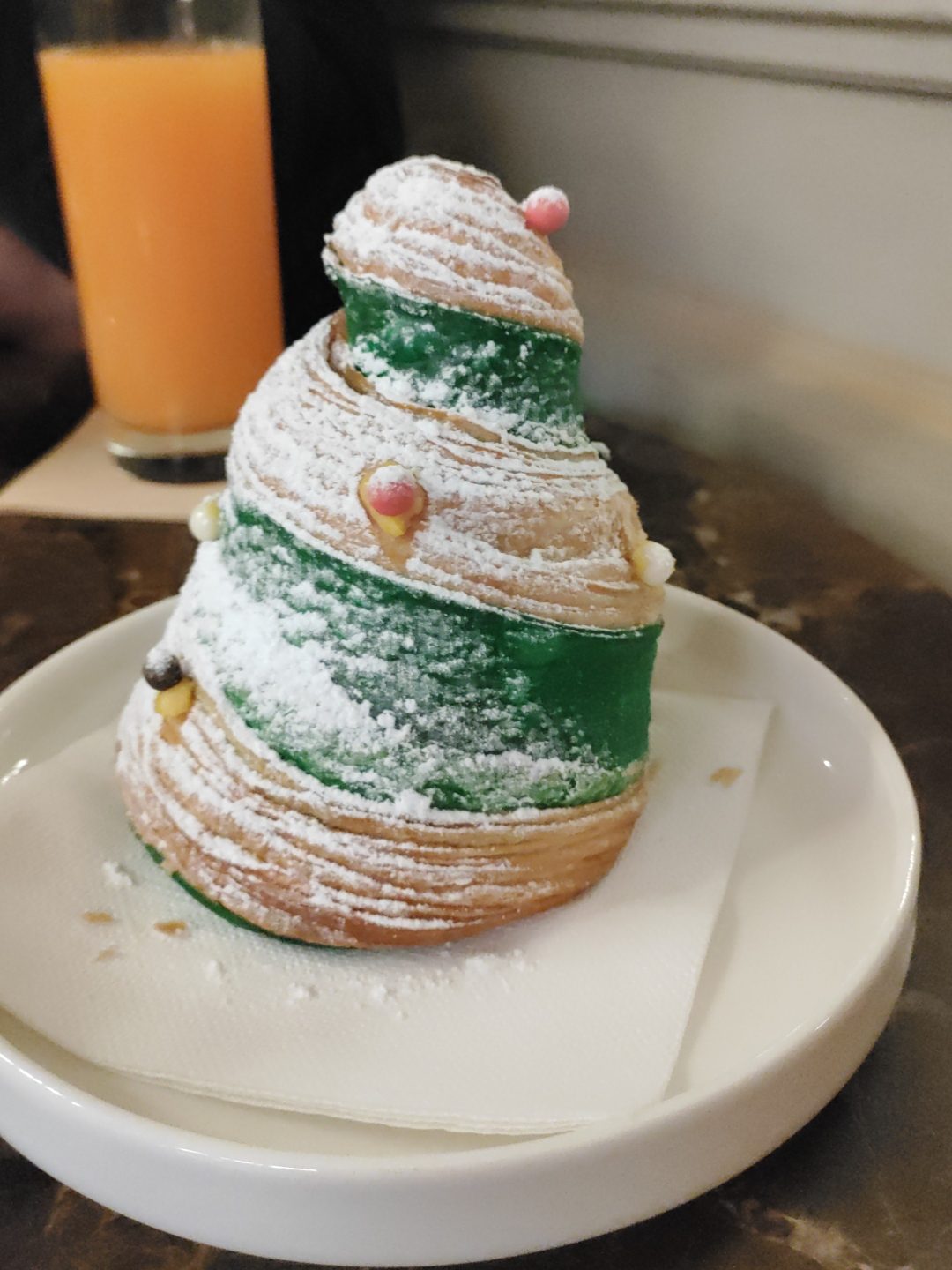 - Caffè San Carlo: ci siamo andanti a gennaio ed ero curiosa di provare il loro Alberello di natale. Un croissant a forma di albero di natale con dentro una crema gialla e praline al caramello. Il posto è bellissimo, molto elegante. Siete proprio nella piazza principale. La fila fuori può essere molto lunga. Quindi, è consigliabile andare molto presto se pensate di fare colazione qui.