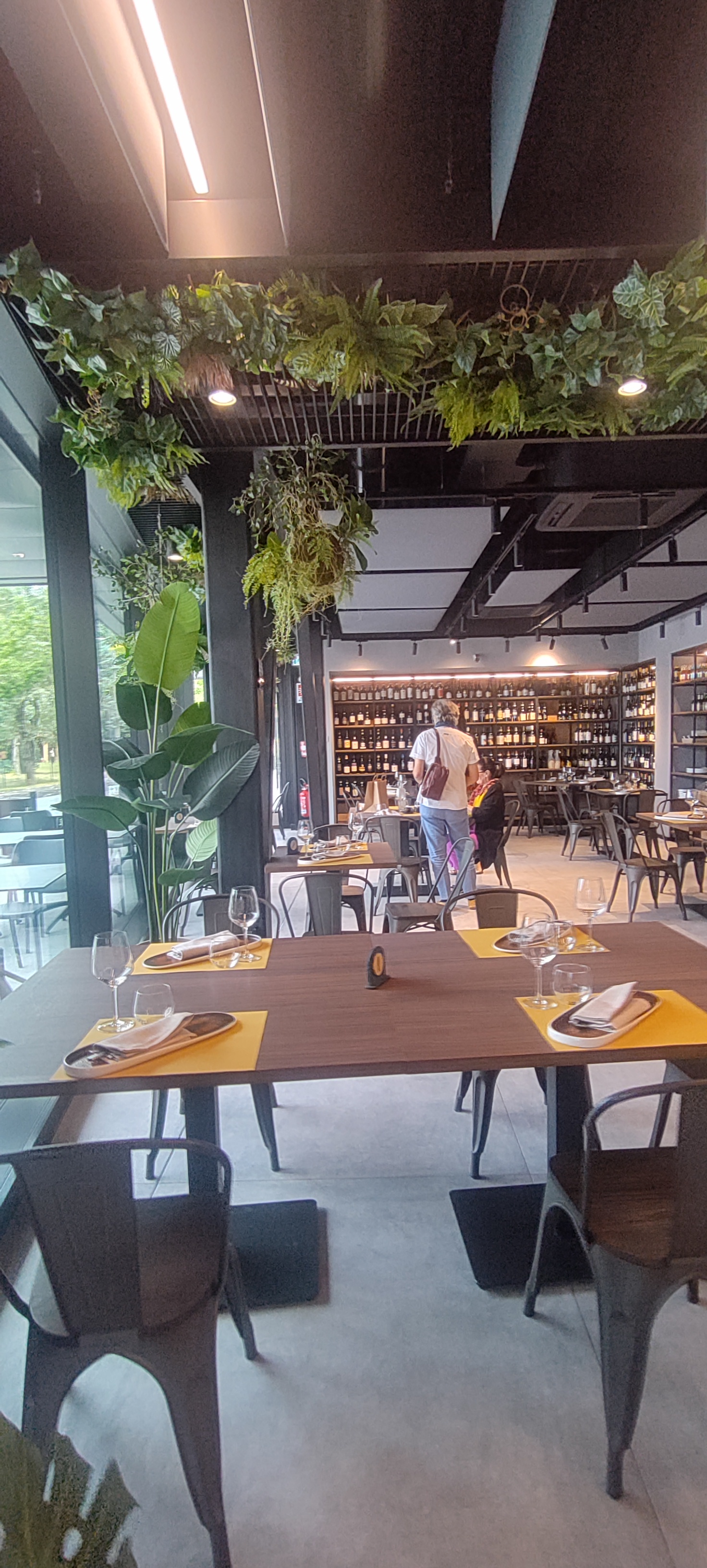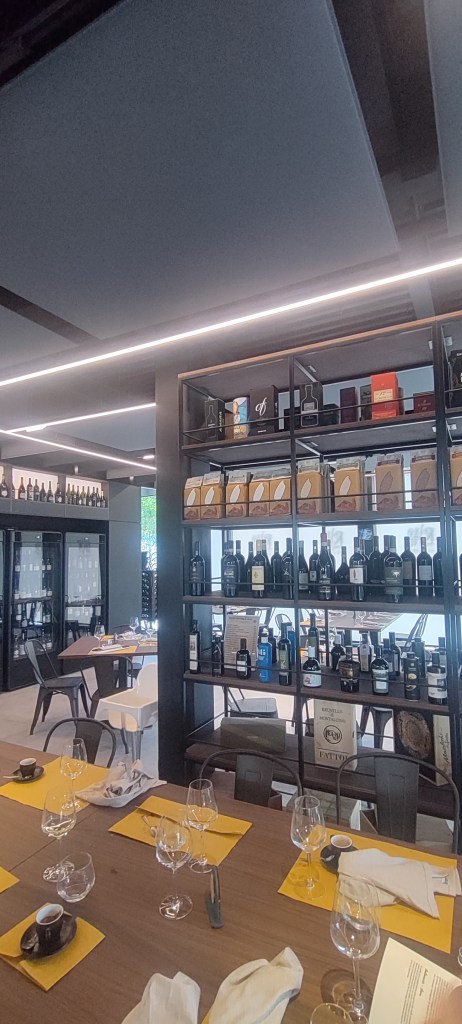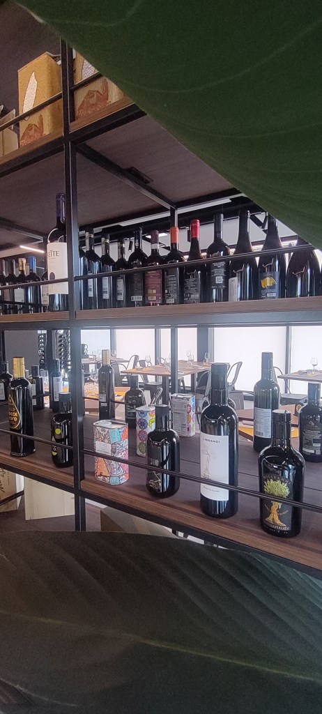 L’interno è molto luminoso. Sono presenti grandi vetrate che circondano l’intero perimetro. In più, piante e scaffali mostrano la varietà di vino e olio a disposizione.